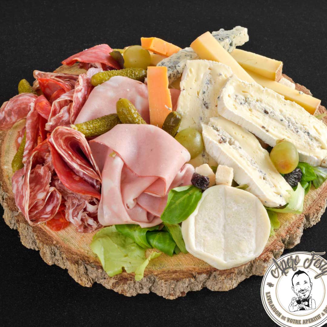 Mortadelle, Rosette, Jambon cru, Coppa, Chorizo, Camembert à la truffe, saint nectaire AOP, compte 12 mois d’affinage, Mimolette